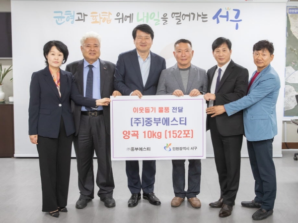 [뉴스서치] 인천 서구는 지난 18일 뷰티풀파크 내 표면처리강재 제조 전문 기업 ㈜중부에스티(대표 함종권)가 이웃돕기 물품 전달을 위해 양곡 152포(10kg)를 기부했다고 밝혔다.