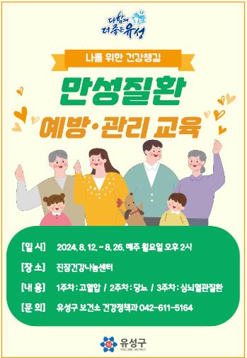 [뉴스서치] 대전 유성구는 오는 8월 12일부터 26일까지 매주 월요일 오후 2시에 진잠건강나눔센터에서 지역 주민을 대상으로 ‘나를 위한 건강챙김’ 만성질환 예방·관리 교육을 운영한다.