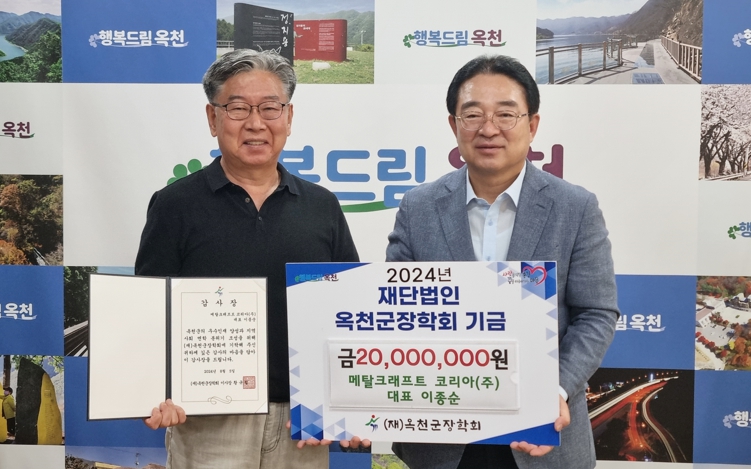 [뉴스서치] 메탈크래프트 코리아(주)는 5일 옥천군청을 방문해 지역 인재 양성을 위한 장학금 2천만 원을 옥천군장학회에 기탁했다.