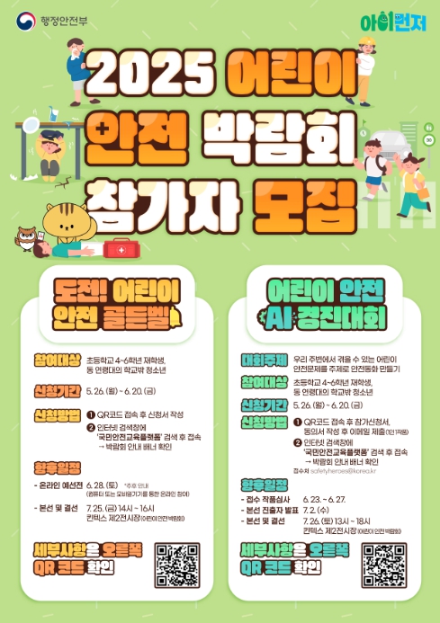 [뉴스서치] 행정안전부는 5월 26일부터 6월 20일까지 ‘2025 어린이 안전 박람회’에 참가할 어린이를 모집한다.