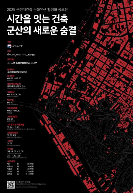 국가유산청이 주최하고, (사)도코모모코리아가 주관하는 이번 공모전은 ‘시간을 잇는 건축, 군산의 새로운 숨결’이라는 주제로, 개항기부터 산업화를 거쳐 우리 생활공간에 남아 있는 근현대 건축물에 대한 인식을 개선하고, 보존과 활용에 대한 실질적인 대안을 제시하기 위해 마련됐다.