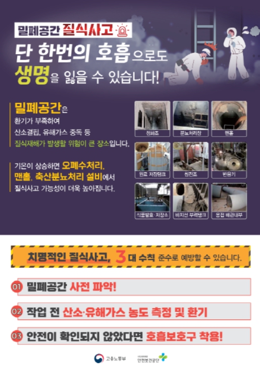 밀폐공간 질식 재해는 산소결핍, 유해가스 중독 등으로 발생하는 재해로서 재해자 2명 중 1명이 사망할 정도로 치명적이다. 특히, 기온이 올라가면 유해가스가 더 많이 발생해 맨홀, 오폐수처리시설, 축사 등에서의 질식사고 위험성은 더욱 커진다.