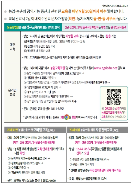 또한 시간과 장소에 구애받지 않고 교육을 받을 수 있도록, ‘농업교육포털’을 통해 온라인 교육도 제공된다. 스마트폰을 이용해 교육 영상을 시청할 수 있으며, 70세 이상 고령 농업인은 자동전화교육을 통해 음성으로 교육 내용을 들을 수 있다.