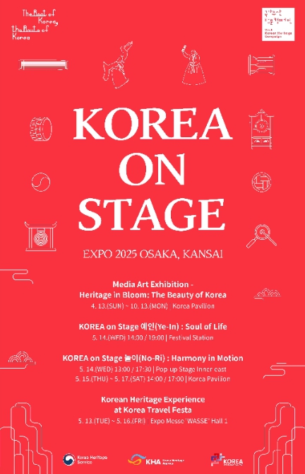 2025 오사카·간사이 엑스포에서 5월 13일부터 17일까지 운영되는 ‘한국 주간’에서는 우리나라 무형유산 명인들의 전통 공연, 미디어아트 전시 등으로 구성된 ‘코리아 온 스테이지’ 행사가 개최되어 전 세계 관람객들이 우리 국가유산의 미래가치를 함께 누릴 예정이다.