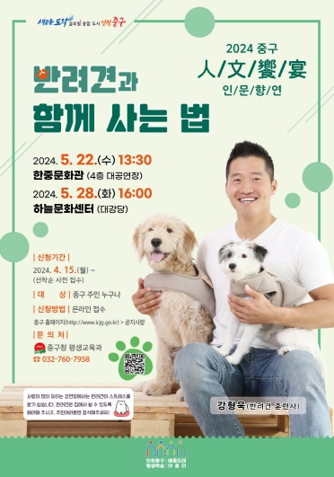 인천시 중구는 ‘[동행] 반려견과 함께 사는 법’이라는 주제로 올해 첫 ‘중구 인문향연(人文饗宴)’을 오는 5월 중 원도심과 영종국제도시에서 총 두 차례 개최한다고 29일 밝혔다.