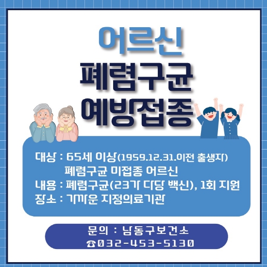▲ 남동구, 65세 이상 어르신, 무료 폐렴구균 예방접종 하세요 |