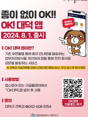 대덕구는 전자문서 안내 및 고지 발송 서비스, ‘OK!대덕 애플리케이션'을 시행한다고 1일 밝혔다.