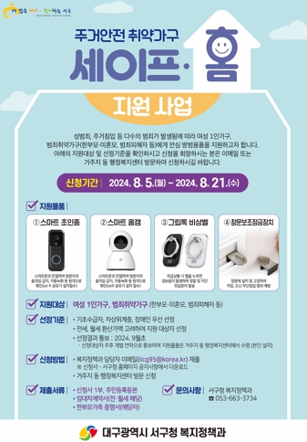 [뉴스서치] 대구광역시 서구는 관내 여성 1인가구, 범죄취약가구 등을 대상으로 '주거안전 취약가구 세이프-홈'지원 사업을 추진한다고 밝혔다.