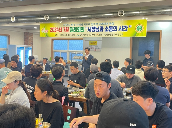 [뉴스서치] 안병구 밀양시장은 지난 9일 저녁 지역 내 식당에서 열린 밀양시청년농업인4-H회(회장 박도현) 7월 월례회행사에 참석해 청년 농업인 60여 명을 격려하고 소통하는 시간을 가졌다.