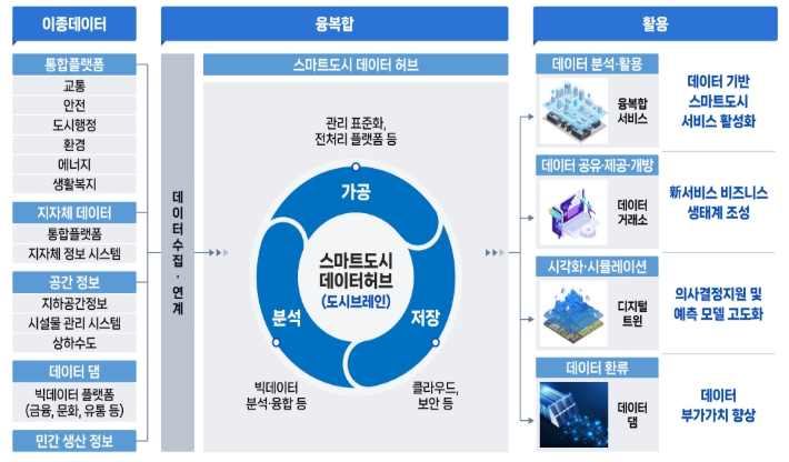 ‘스마트도시 데이터허브’ 는 교통 ‧ 안전 등 다양한 도시데이터를 한 곳에모아놓은 도시정보 플랫폼으로, 데이터허브에 모인 데이터를 연계‧분석하여 새로운 도시서비스를 만들 수 있고 지방자치단체가 도시를 효율적으로 운영할 수 있도록 돕는 역할을 한다.