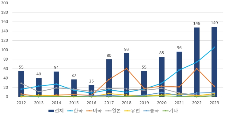 | ▲ 출원인 국적별 특허출원 동향(2012년~2023년) |