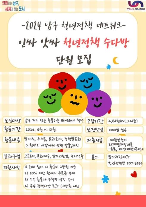 [뉴스서치] 부산 남구는 4월 15일부터 남구 청년들의 목소리를 반영한 실효성 있는 정책 발굴과 청년정책 거버넌스 구축을 위한 '2024 청년정책 네트워크‘남구 인싸 앗싸 청년정책 수다방 사업’' 참여자를 모집한다.