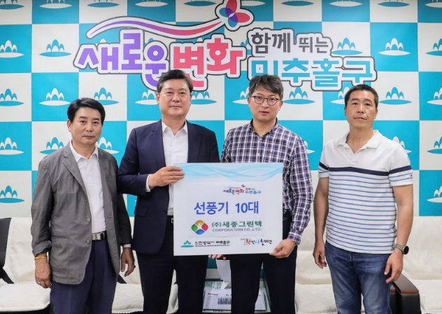 [뉴스서치] 인천 미추홀구는 19일 ㈜세종그린텍으로부터 관내 취약계층의 시원한 여름 나기를 위한 선풍기 10대를 전달받았다.