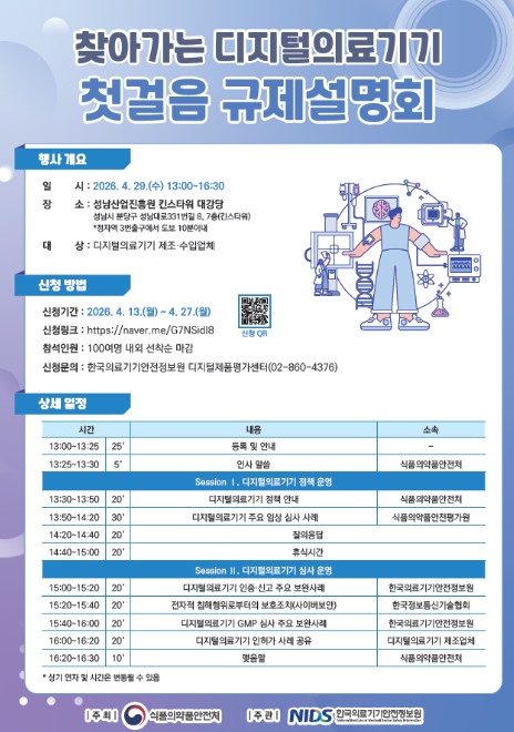 [뉴스서치] 식품의약품안전처는 디지털의료기기 분야 청년 기업이 밀집한 지역을 직접 찾아가 현장의 목소리를 청취하는 ‘찾아가는 규제설명회’를 4월 29일 성남산업진흥원 킨스타워(경기도 성남시 소재)에서 개최한다고 밝혔다.