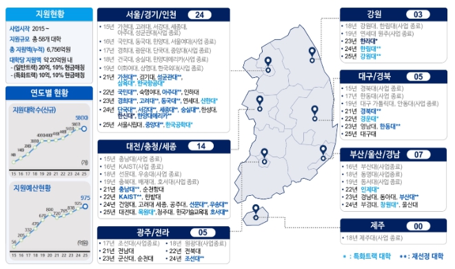 과기정통부는 올해 10개 대학(일반분야 8개, 특화분야 2개)을 선정하고 일반분야(트랙) 대학에는 연 20억 원, 특화 분야(트랙)에는 연 10억 원을 지원할 예정이다.