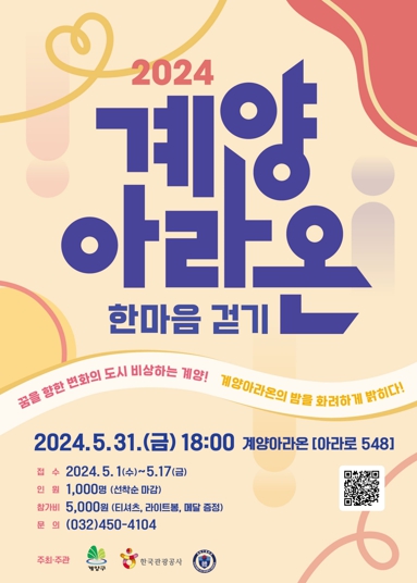 참가 신청은 5월 1일부터 5월 17일까지 계양구청 누리집을 통해 접수 링크로 연결 또는 관내 홍보 현수막과 포스터에 게시된 QR코드를 통해 온라인으로 신청할 수 있으며, 개인별 참가비는 5천 원이다. 참가자들에게는 티셔츠, 라이트봉, 기념 메달을 증정할 계획이며, 자세한 사항은 계양구청 문화체육관광과로 문의하면 안내받을 수 있다.