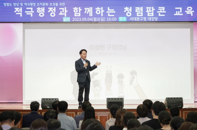 ▲ 서대문구가 최근 행안부로부터 2년 연속 ‘적극행정 우수기관’으로 선정됐다. 사진은 지난해 9월 이성헌 서대문구청장이 직원들과의 ‘청렴토크’에 참여해 발언하고 있는 모습. |