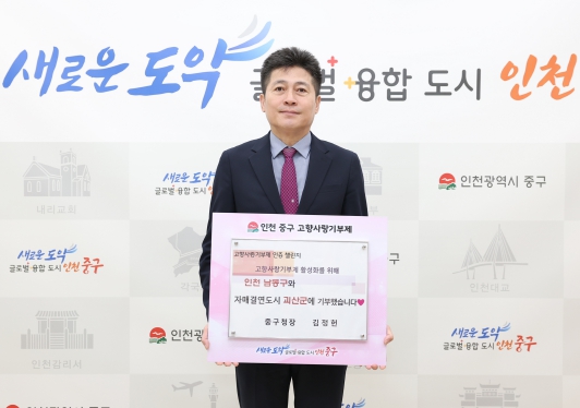 [뉴스서치] 김정헌 인천 중구청장이 지난 20일 ‘고향사랑기부제 인증 챌린지’에 동참하며, 이웃 도시인 인천 남동구와 자매결연도시인 충북 괴산군에 ‘고향사랑기부금’을 기탁했다.