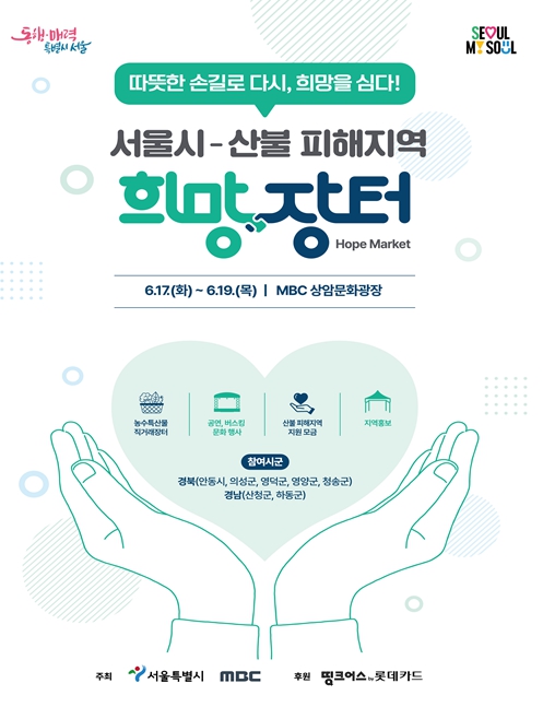 [뉴스서치] 서울시는 최근 대형 산불로 삶의 터전을 잃고 경제적 어려움에 처한 경북·경남 지역 농가들을 돕기 위해 오는 6월 17일부터 19일까지 3일간 MBC 상암문화광장에서 ‘산불피해지역 희망장터’를 개최한다고 밝혔다.
