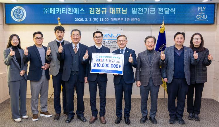 [뉴스서치] 경상국립대학교는 2월 3일 오전 11시 대학본부 3층 접견실에서 ㈜메카티엔에스 김경규 대표가 대학발전기금 1000만 원을 기부했다고 밝혔다.