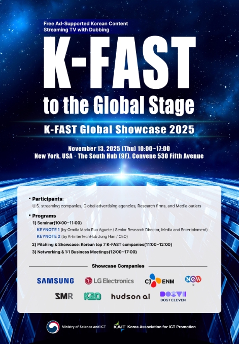 [뉴스서치] 과학기술정보통신부는 국내 최초로 K-FAST를 북미에 홍보하기 위한 행사인 '글로벌 K-FAST 쇼케이스'를 11월 13일(현지시간), 뉴욕에서 개최한다고 밝혔다.
