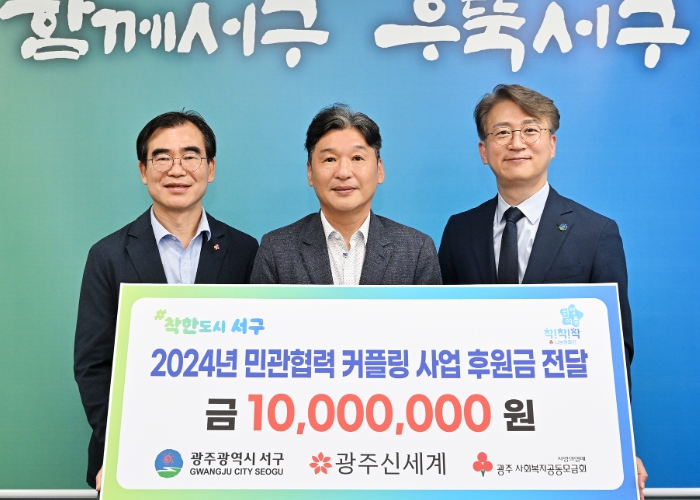 [뉴스서치] 광주광역시 서구는 4일 ㈜광주신세계(대표이사 이동훈)로부터 민관협력 커플링 사업 추진을 위한 후원금을 전달받았다.