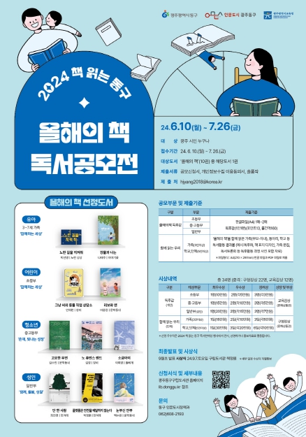 [뉴스서치] 광주 동구는 오는 7월 26일까지 책 읽는 문화 확산과 독서 의욕을 높이기 위한 2024 책 읽는 동구 ‘올해의 책’ 독서공모전을 개최한다고 밝혔다.