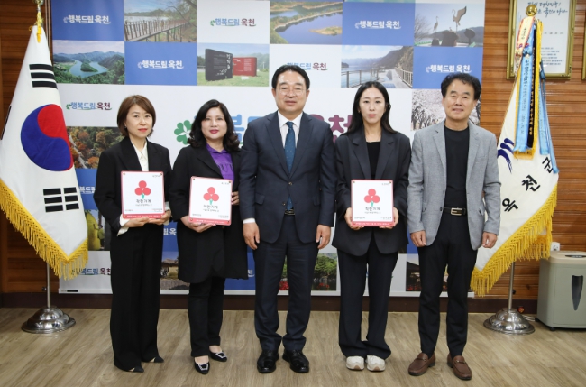이날 인증 현판을 받은 착한가게는 △95호 이지헤어(염재은) △96호 ㈜대광(남정만) △97호 알파옥천점(박미숙) △98호 북경반점(최무진) △99호 유화아뜰리에(유은하) △100호 라인떡방(곽재경) 6개소다.