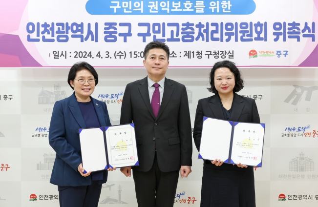 [뉴스서치] 인천시 중구는 지난 3일 제1청 구청장실에서 ‘구민고충처리위원회 위원 위촉식’을 가졌다.