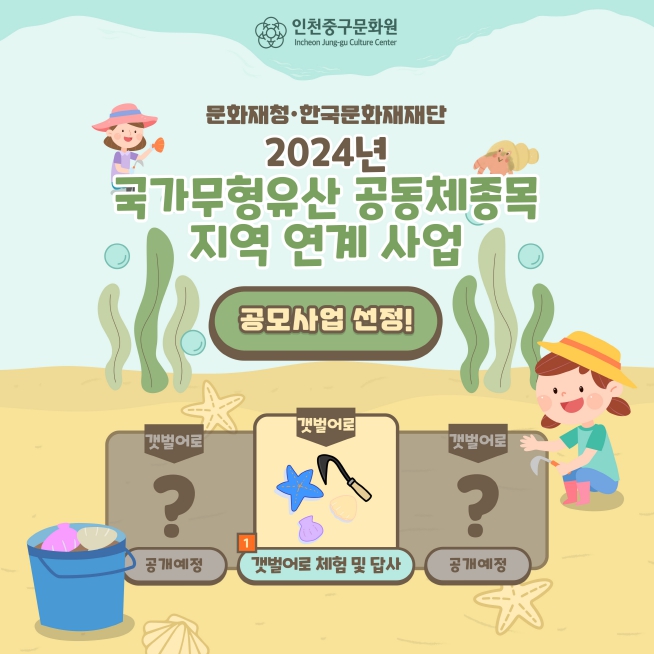 김정헌 중구청장은 “인천중구문화원에서 2024년 국가무형유산 공동체종목 지역 연계 지원 사업 2년 연속 선정에 대하여 박봉주 인천중구문화원장을 비롯한 직원들의 노고에 감사하고 선정된 사업을 통해 갯벌어로에 한층 더 가깝게 알아갈 수 있는 시간이 되길 바라며, 아울러 어촌공동체의 전통풍습이 앞으로도 후세에 널리 전승되는 데 중구문화원이 큰 도움이 될거라 믿는다”고 밝혔다.