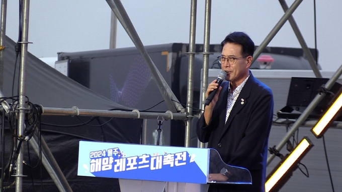 ▲ ‘2024 울주 해양레포츠대축전’이 지난 3일부터 4일까지 이틀간 울주군 대표 관광지인 진하해수욕장에서 개최된 가운데 이순걸 울주군수가 개막식에서 참석자들에게 인사말을 하고 있다. |