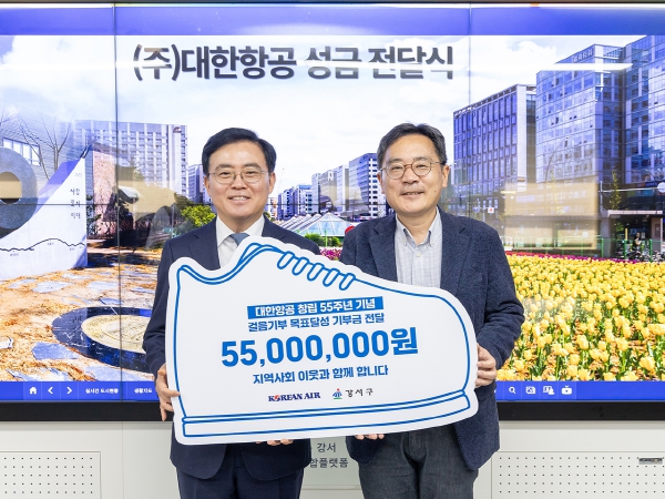 이날 지상휘 사회봉사단 운영위원장은 “대한항공 창립 55주년 기념 ‘전 직원 걸음 기부 캠페인’을 통해 마련한 성금”이라며 “지역의 어려운 이웃을 위해 써달라”고 기탁했다.