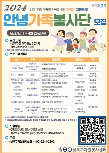 [뉴스서치] 서울 성북구가 오는 4월 25일까지 가족이 함께 봉사활동에 참여하여 지역사회 나눔을 실천하는 “2024 안녕가족봉사단”을 모집한다.