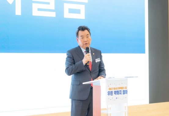 ▲ 지난 3일 강남구청 1층 로비에서 개최된 “마약류 및 약물 오남용 예방 공동대책협의회 선포식”에서 축사 중인 김형대 의장