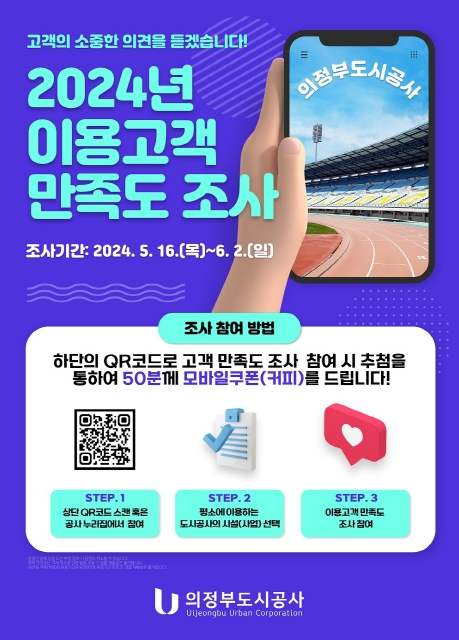 공사에서 자체적으로 실시하는 이번 이용 고객 만족도 조사는 QR코드를 통하여 참여하거나 의정부도시공사 누리집 ‘알려드립니다’의 안내 게시물 온라인을 통해서도 참여할 수 있다.