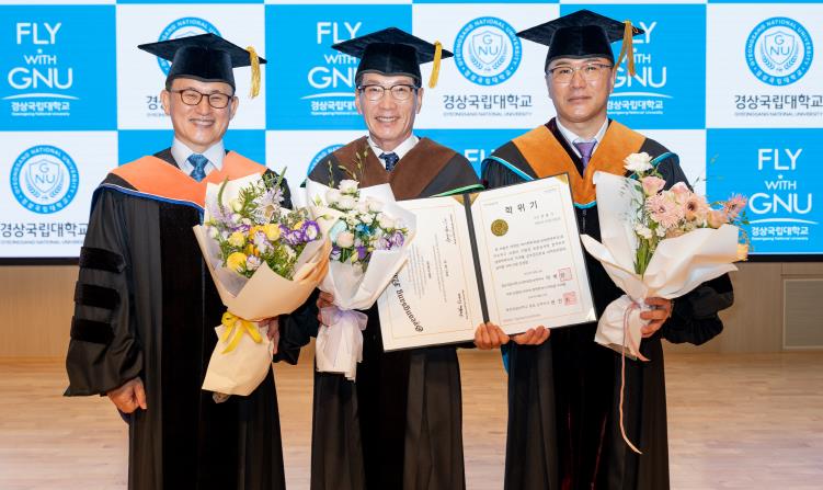 ▲ 35년간 경찰로 재직한 한용기 씨는 환갑이던 2020년에 학사모를 썼고 학업을 이어가 올해 드디어 경상국립대학교에서 경영학 박사학위를 취득했다. 한용기 박사가 권진회 총장, 오재신 지도교수와 함께 기념사진을 찍고 있다. |
