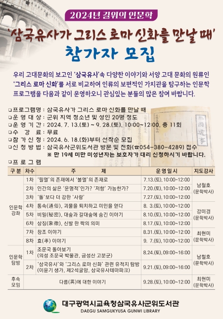 [뉴스서치] 삼국유사군위도서관은 2024년 길 위의 인문학 ‘삼국유사가 그리스 로마 신화를 만날 때’를 오는 7월 13일부터 9월 28일까지 11회에 걸쳐 운영한다.