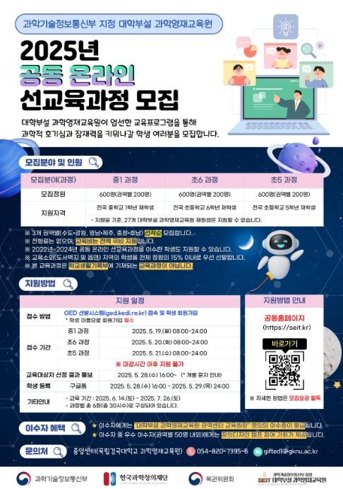 [뉴스서치] 과학기술정보통신부와 한국과학창의재단은 오는 5월 19일부터 21일까지 전국 초‧중등 학생 대상 ‘2025년 대학부설 과학영재교육원 공동 온라인 선교육과정’ 수강생을 모집한다고 밝혔다.