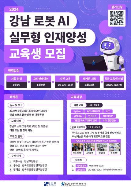 [뉴스서치] 꿈이 모이는 도시, 미래를 그리는 강남구가 로봇AI 실무형 인재 양성 과정의 교육생을 선발하기 위해 18일 9시~18시 강남스포츠문화센터 4층 대체육관에서 ‘로봇AI 해커톤’을 개최한다.