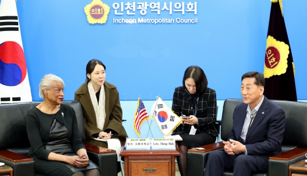 [뉴스서치] 인천광역시의회 이봉락 의장은 28일 한국국제교류재단(KF) 글로벌네트워크 사업부의 초청 사업에 참석하고자 방한한 엘비 그레이잭슨 의원을 만나 인천-앵커리지 직항 노선 개설과 우호 협력 관계 강화 방안 등에 대해 논의했다.