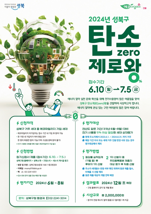 구는 6월 10일부터 7월 5일까지 ‘2024 탄소제로(zero)왕 선발 이벤트’ 참여자를 모집한다. 성북구민이라면 누구나 참여할 수 있으며, 전기 사용량 조사를 위해 서울시 에코마일리지 가입이 필수다.