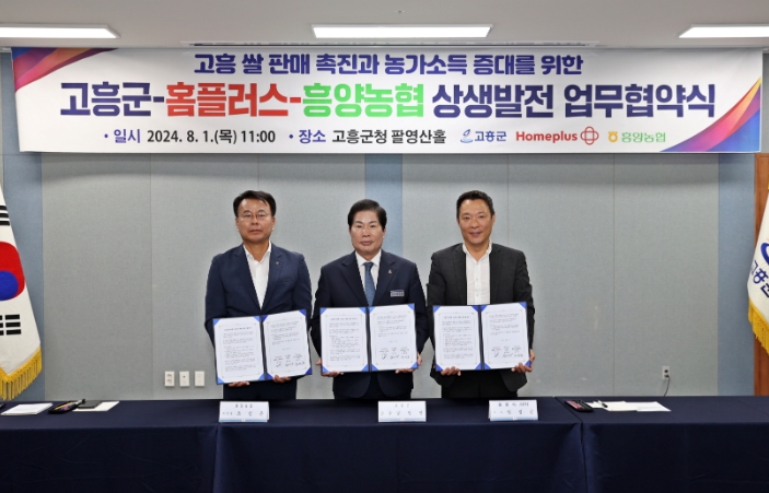 [뉴스서치] 고흥군공영민)은 1일 군청 팔영산홀에서 국내 최고 유통업체인 홈플러스와 흥양농협이 함께 고흥 쌀 판매 촉진과 농가 소득증대를 위한 3자 업무협약을 체결했다고 밝혔다.