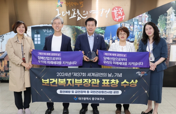 [뉴스서치] 대구 중구는 지난 5월 31일 여의도 전경련회관에서 열린 제37회 세계금연의 날 기념식에서 흡연예방 및 금연정책 등 국민건강증진에 기여한 공을 인정받아 보건복지부 장관 표창을 수상했다.