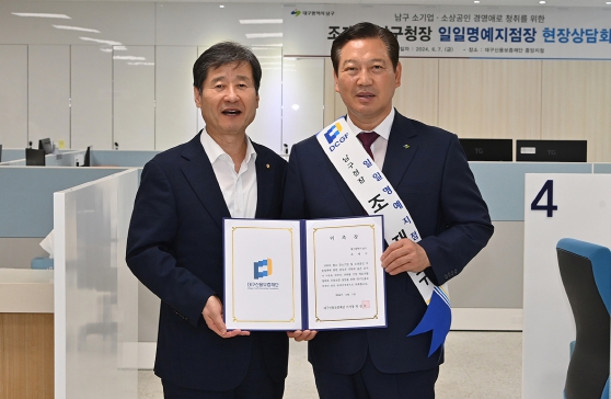 이에 박진우 이사장은 “평소 남구 중소기업·소상공인에 대한 깊은 관심과 지원으로 지역경제 발전에 애써주시고, 이번에도 대구신보 일일명예지점장으로 성실히 임무를 다해주신 조재구 남구청장님께 감사드린다”며, “대구신보도 민생경제 현장의 중소기업·소상공인과 함께 호흡하며 지역경제 활력 회복을 위해 앞장서겠다”고 말했다.