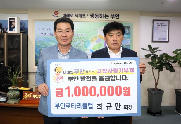 [뉴스서치] 부안군은 부안로타리클럽 최규만 회장이 고향사랑기부금 100만원을 기탁했다고 밝혔다.