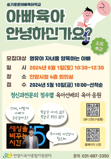 교육대상 및 인원은 영유아의 남성 양육자 100명이며, 교육신청은 오는 10일 오전 10시부터 안양시육아종합지원센터 홈페이지에서 할 수 있다.