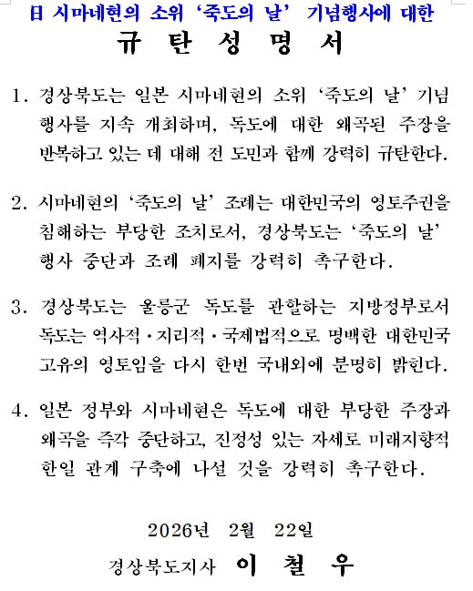 [뉴스서치] 경상북도는 22일, 일본 시마네현이 소위 ‘죽도의 날’ 행사 개최에 대해 강력히 규탄하며, 행사 즉각 중단과 관련 조례 폐지를 촉구했다.