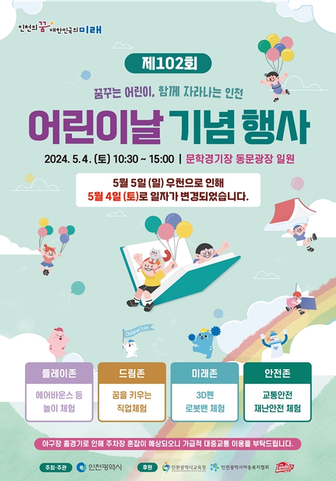 [뉴스서치] 인천광역시는 ‘제102회 어린이날 기념행사’를 4일 오전 10시 30분부터 문학경기장 동문 광장에서 개최한다고 밝혔다.