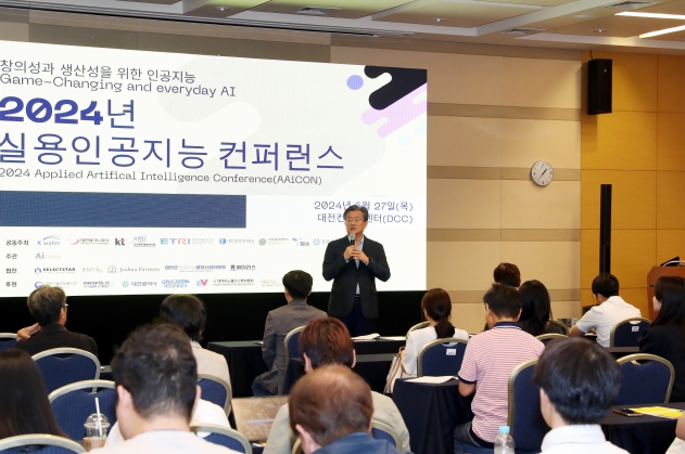▲ 27일 대전컨벤션센터(DCC)에서 열린 2024년 실용인공지능 컨퍼런스에서 유성 데이터 기반 실증 리빙랩 특별세션에 앞서 정용래 유성구청장이 인사말을 하고 있다. |