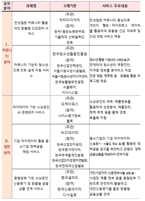 올해는 특히 마이데이터의 핵심 가치인 정보주체의 ‘자발적 참여’를 강화하기 위해 '공동체(커뮤니티) 분야(총 2건, 과제당 6.5억 원)’를 신설했다. 공통의 관심사로 구성된 공동체(커뮤니티)와 연계하여 정보주체가 자신의 데이터를 자발적으로 제공하고, 그에 따른 맞춤형 혜택 및 보상을 받는 구조다. 또한, 기존처럼 다양한 산업 분야에서 개인 맞춤형 정보(마이데이터) 기반의 혁신 서비스를 발굴·지원하는 ‘일반 분야(총 3건, 과제당 5억 원)’ 과제도 병행하며, 이번 공모에는 총 25개 연합체(컨소시엄)(90개 기업 참여)가 지원해 5:1의 경쟁률을 기록했다.